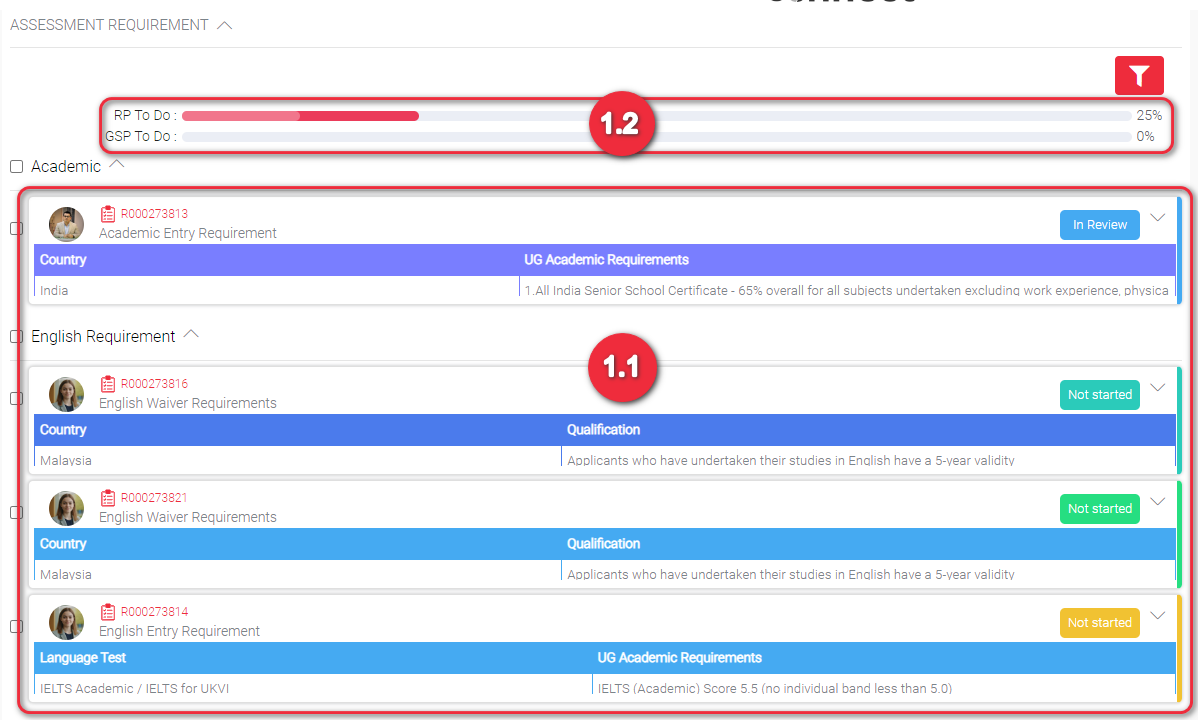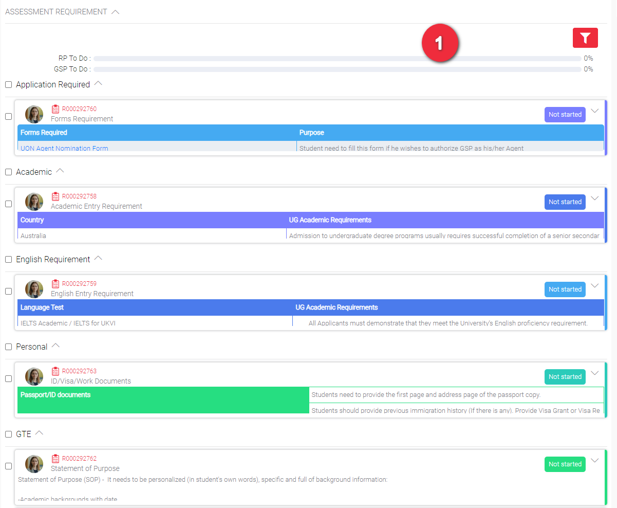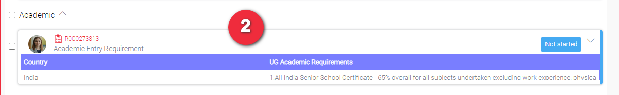 When you apply for a course that has Assessment Requirement, you should be able to find this same items in the Application Record Page. The requirement has now become a checklist to easily monitor the progress of each. The status of each requirement in the checklist is also displayed. By default the status of each is “Not started”.
