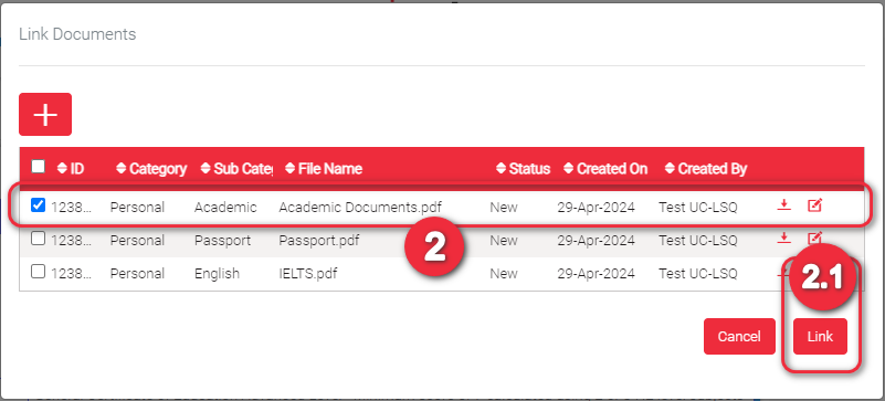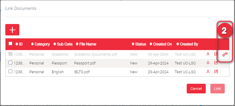A pop-up will appear displaying all the documents you can link to this requirement. Check all that applies. If the document that you want to link is not yet uploaded in the list, click ” + ” to upload document/s.