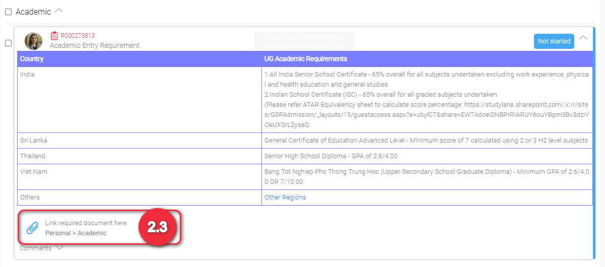 Click “Link required documents here”. You can also notice that it specifies the category and sub category of the required document. For instance in the example below, Personal > Academic.