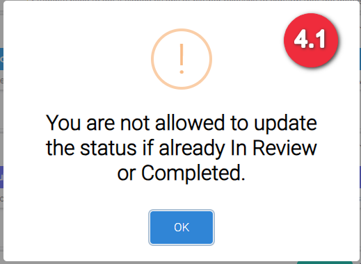 Image 4.1 When a status is already “In Review” or “Completed” you can no longer update the status. But you can still link documents and make comments. When you click the status, a notification will be displayed: