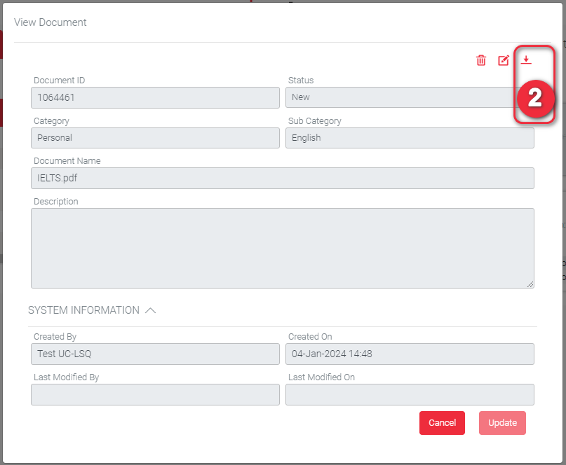When a pop-up is displayed with the document details, click the download icon found on the top right of the pop-up.