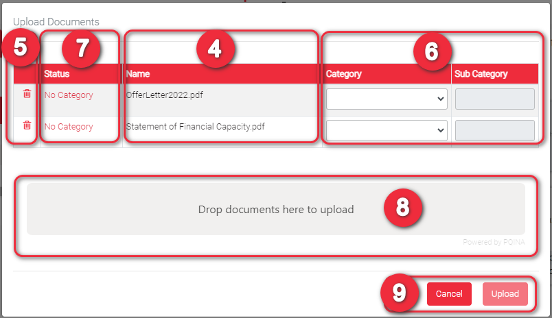 If you forgot to include any document(s) at this point, you can still add in the list before you upload them all. It’s the same process as when you click the ‘+’ to add documents. Here you just need to drag the selected documents you want to add and select a ‘Category’.
